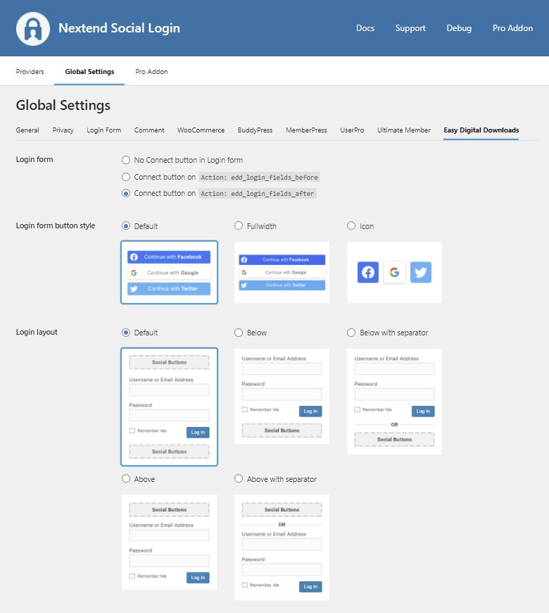 edd_login_fields_beforeaction. - Connect button after login form: The social connect buttons show up after the login form using the
