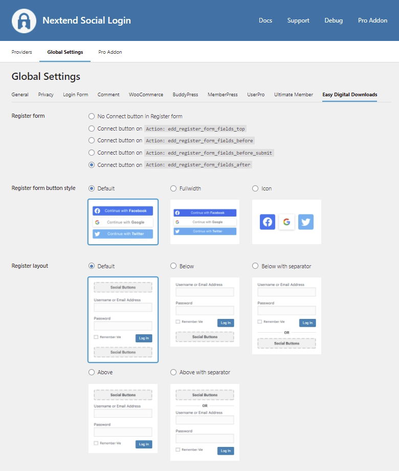 edd_register_form_fields_before_submitaction. - Connect button after register form: The social connect buttons show up after the register form’s button using the