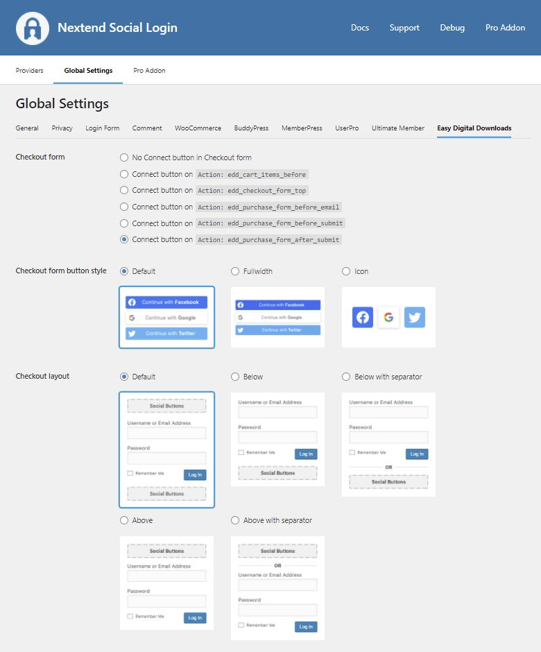 - No Connect button in Checkout form: The social connect buttons are not shown at the Easy Digital Downloads checkout form.