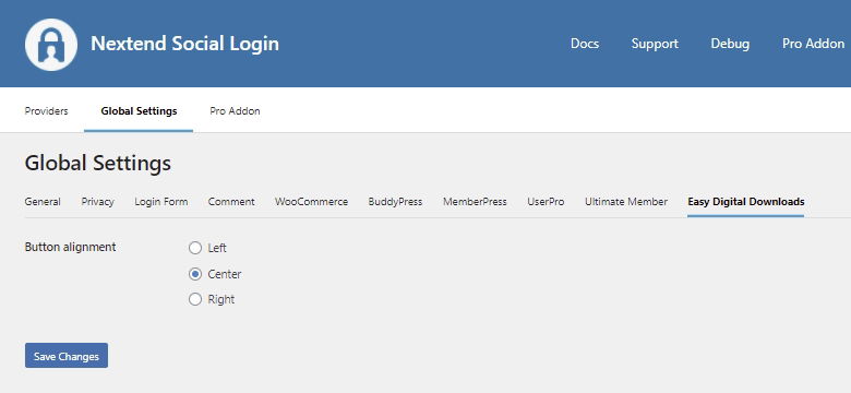 You can use this setting to position the social buttons in Easy Digital Downloads forms to left, center or right.