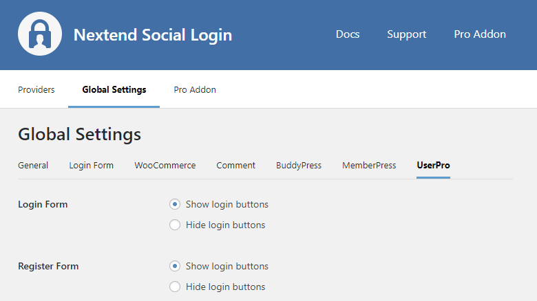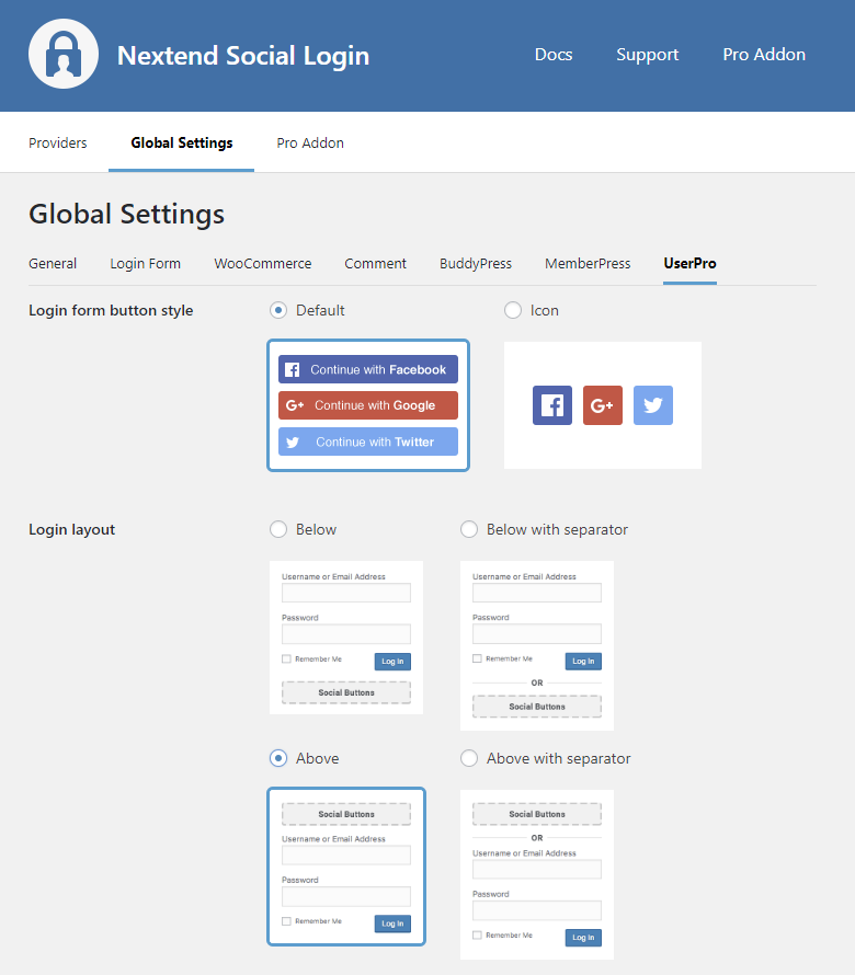 • Show login buttons: shows the login buttons at the UserPro Login form