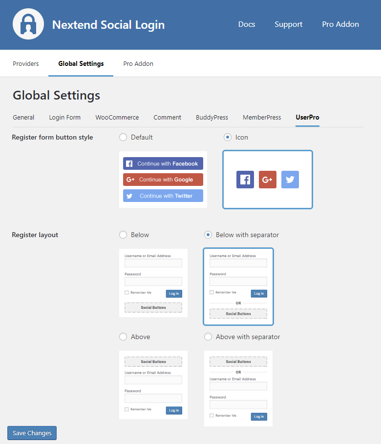 You can use this setting to position the social buttons in UserPro forms to left, center or right.