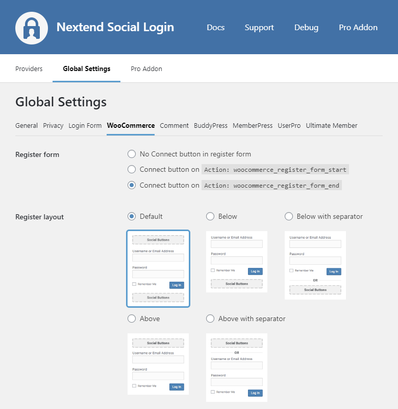 • Connect button after register form: The social connect buttons show up after the register form using the woocommerce_register_form_end action.