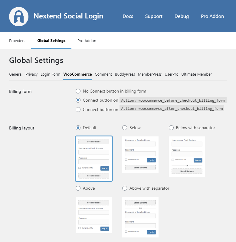 • Connect button before the registration fields of the billing form: The social connect buttons show up before the billing form using the woocommerce_before_checkout_registration_form action. -Available since: 3.0.25