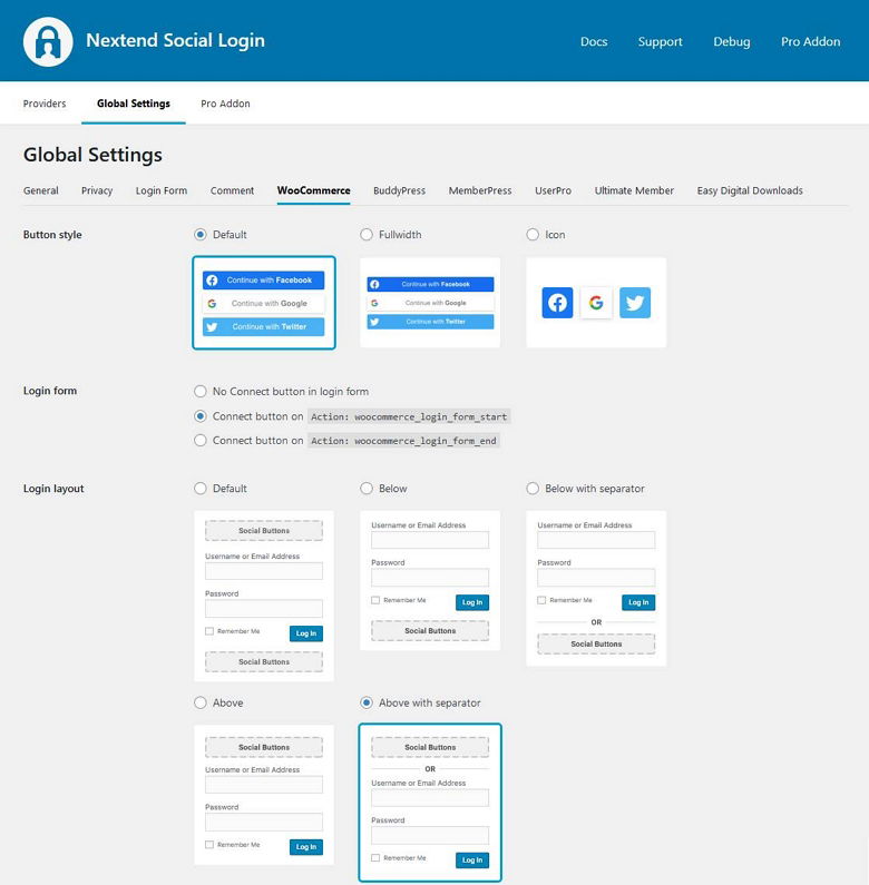 You can choose whether the social buttons in the WooCommerce forms should show up as buttons or icons.