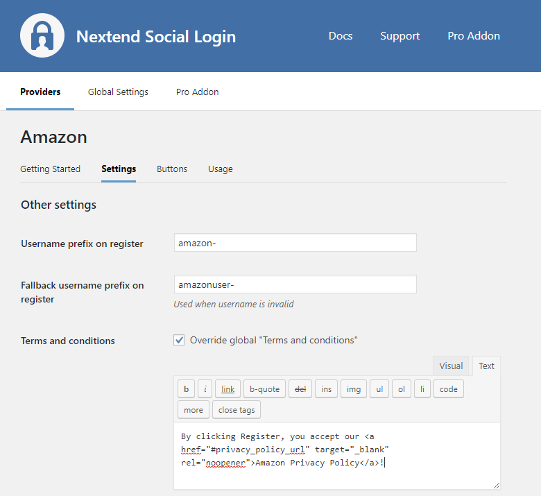 This option can only be seen, if Terms and conditions is set to Show in Global Settings → Privacy tab. Here you can set custom Terms and Conditions for users who register with Amazon. For more information please read our Privacy documentation.