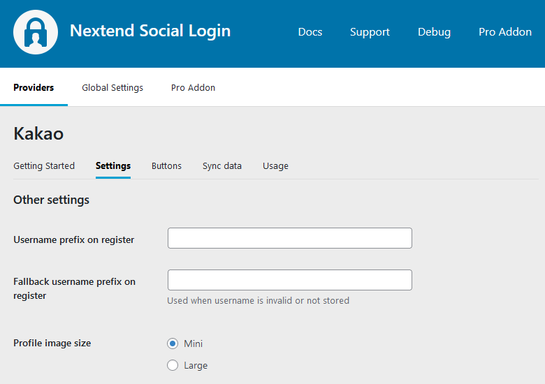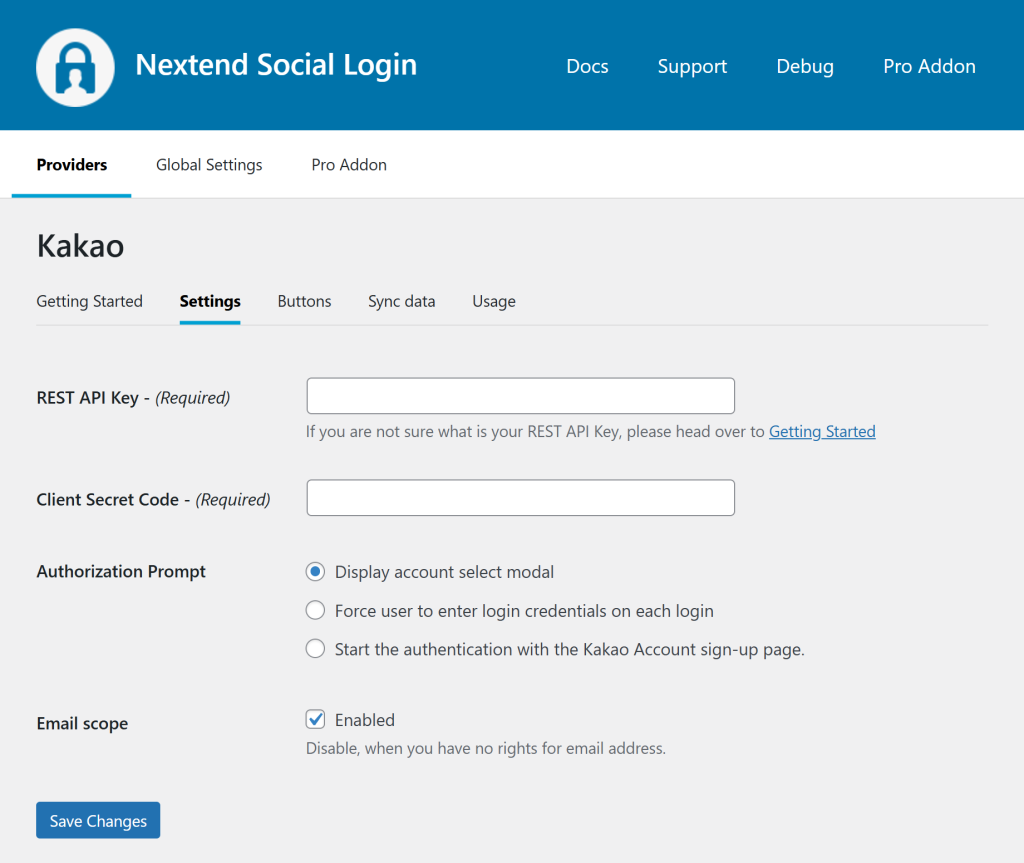 Once your Kakao app is ready you’ll need to copy and paste the REST API Key and Client Secret Code to the Kakao provider’s Settings tab.