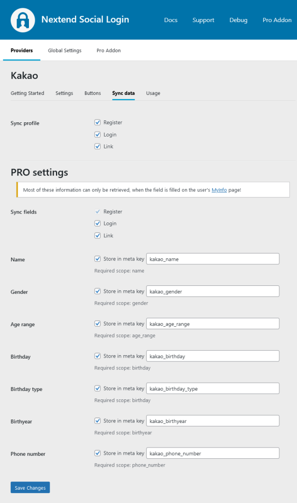 • Sync fields: Determine when the synchronization shall happen. Whenever a user registers, logs in, or links an existing WordPress account with a provider, their data will be retrieved and stored.