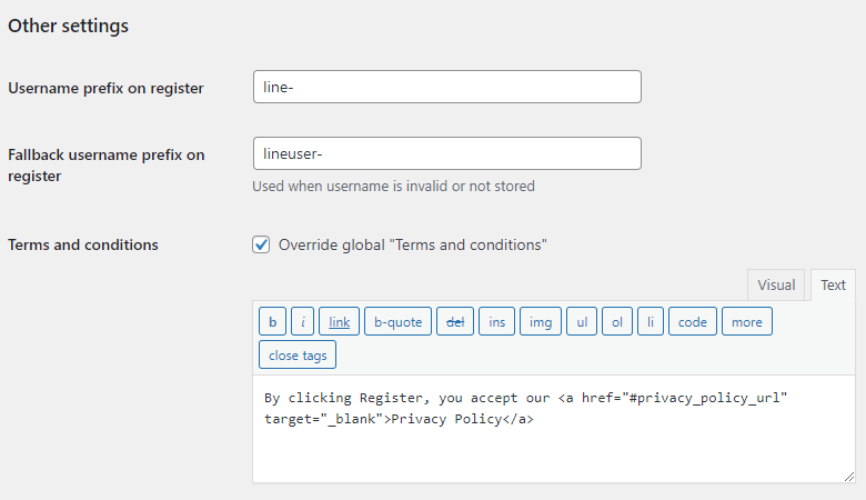 This option can only be seen, if Terms and conditions is set to Show in Global Settings → Privacy tab. Here you can set custom Terms and Conditions for users who register with Line. For more information please read our Privacy documentation.