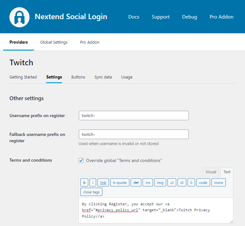 This option can only be seen, if Terms and conditions is set to Show in Global Settings → Privacy tab. Here you can set custom Terms and Conditions for users who register with Twitch. For more information please read our Privacy documentation.